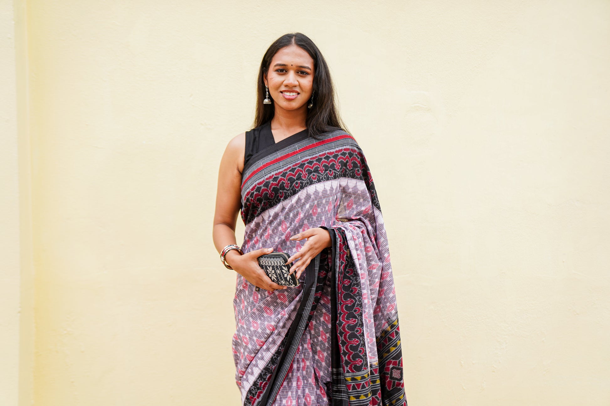 The Charulata Sambalpuri Saree embodies quiet grace and timeless artistry. Its subtle grey-lavender body, adorned with delicate ikat motifs, beautifully contrasts with a bold black border and pallu enriched with intricate red floral and geometric designs.