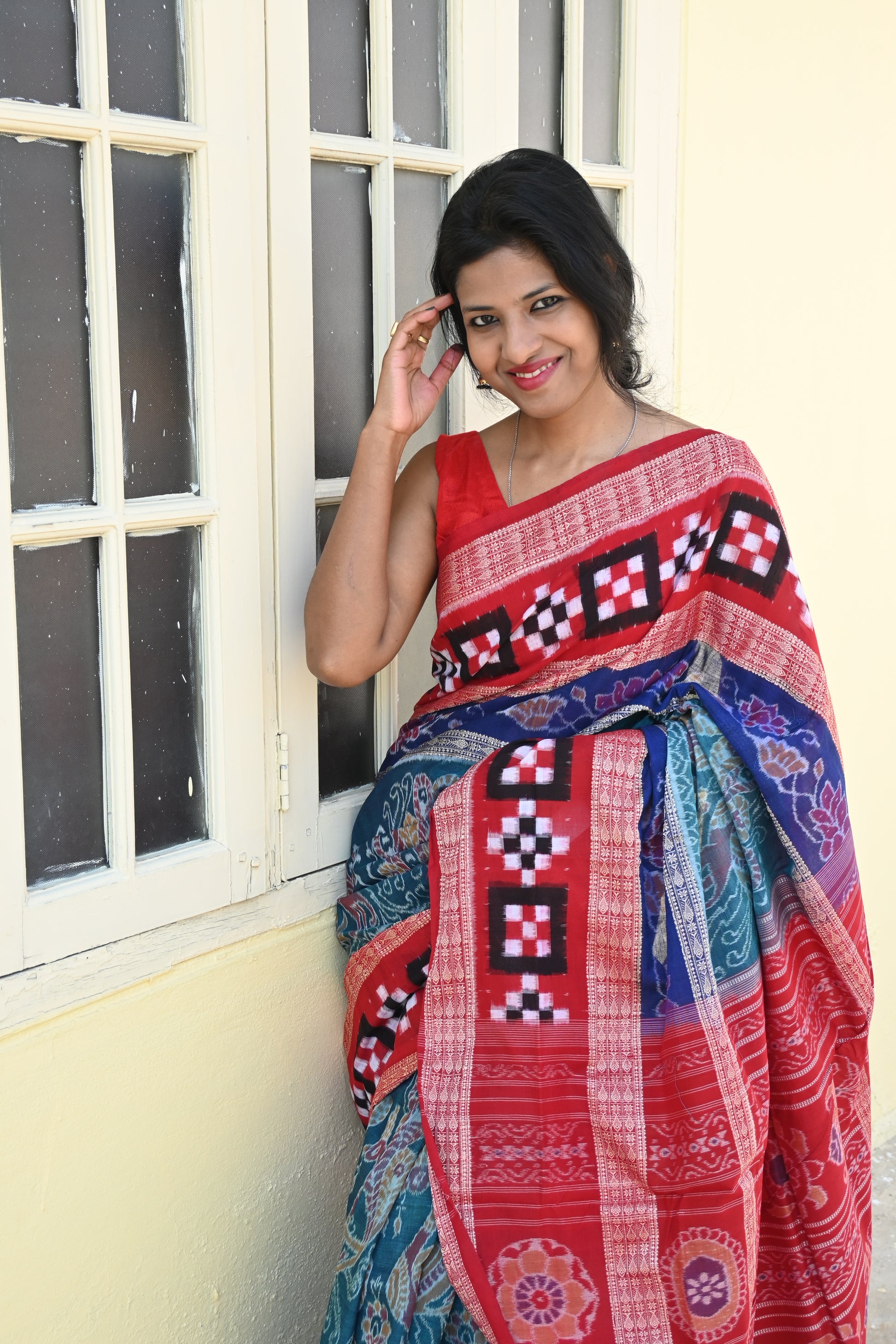 - Color: Rich red pallu with bold checkered ikat + deep teal skirt panel with intricate floral motifs
