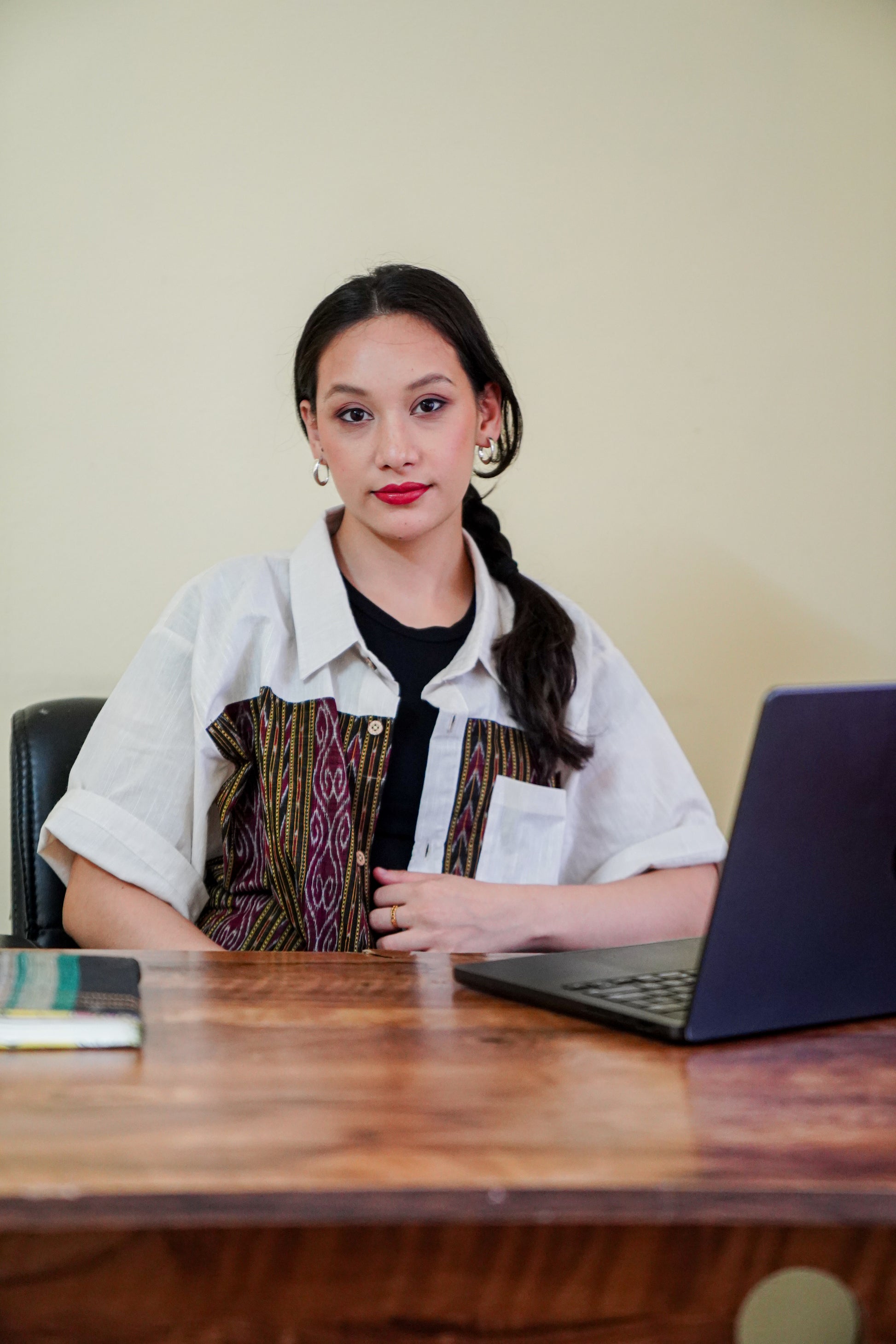 - Color: White with maroon-black Ikat woven panels